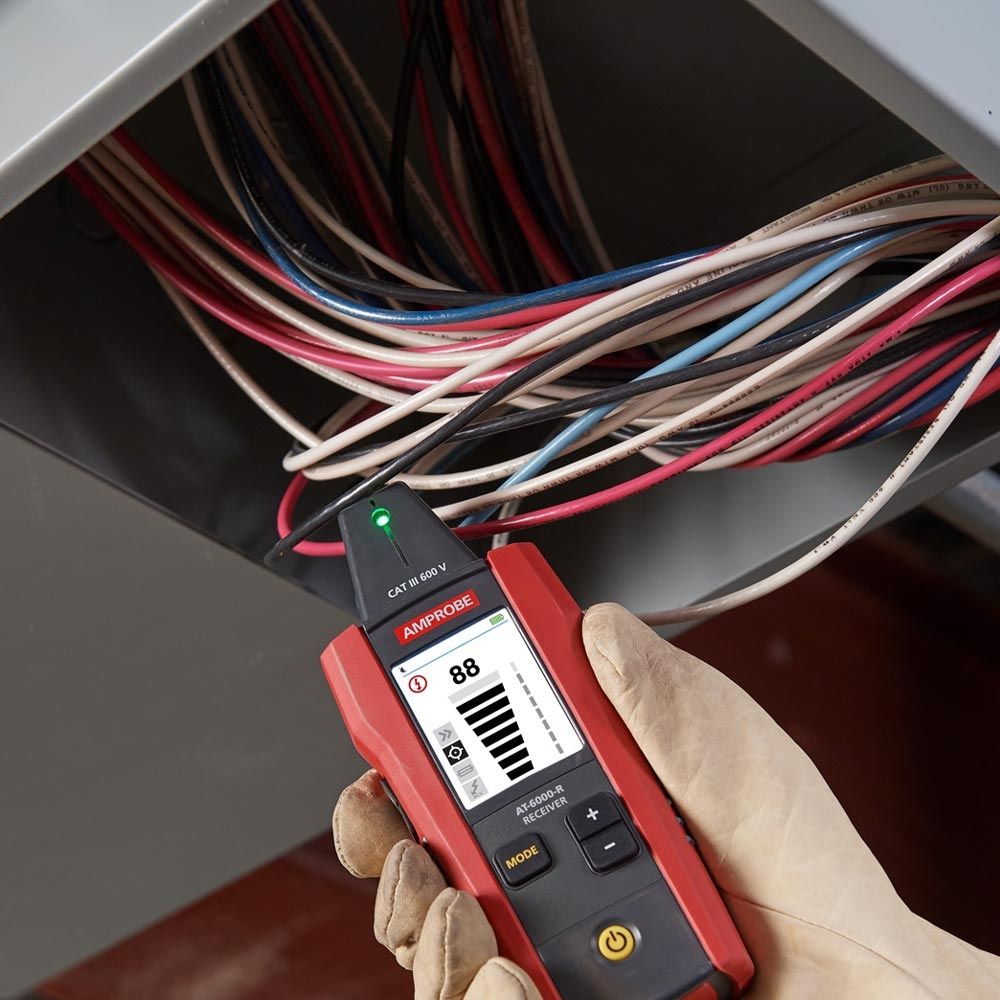 The AT-6000-R Receiver detects the signal in wires and cables using two methods: active tracing method (with the Transmitter) and passive tracing method (without the Transmitter). In hard-to reach areas, the Receiver’s Tip Sensor can be used to trace wires in corners, tight spaces and junction boxes.