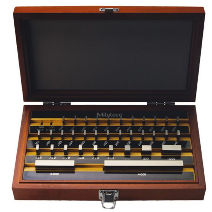 Mitutoyo 516-913-26 INCH Rectangular Gage Block SET of 35 STEEL Gage Blocks, Grade 00. SIZES = (1) .10005, (9) .0001-.1009 at .0001 steps, (9) .101-.109 at .001 steps, (9) .11-.19 at .01 steps, (3) .1-.3 at 0.1 steps and one each .5, 1, 2 4.